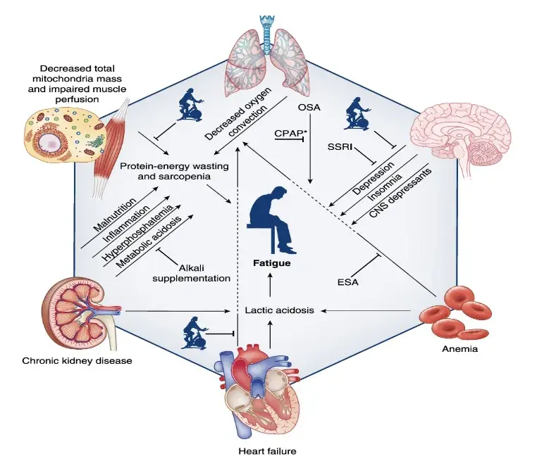 La patogénesis y el tratamiento de la fatiga en pacientes con enfermedad renal crónica (DRC). El ícono de una persona en una bicicleta estacionaria representa la actividad física. Tratamiento de la apnea obstructiva del sueño (OSA). CNS, sistema nervioso central; CPAP, presión aérea positiva continua; ESA, agente estimulante de la eritropoyesis; OSA, apnea obstructiva del sueño; SSRI, inhibidor selectivo de la recaptación de serotonina.
