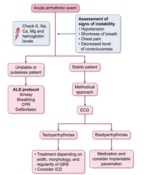 Fluxograma de conduta em eventos arrítmicos agudos na diálise: instabilidade hemodinâmica exige protocolo ACLS imediato; pacientes estáveis devem ser avaliados com ECG e eletrólitos.