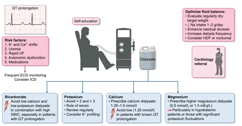 QTc > 450 ms em homens ou > 470 ms em mulheres já é considerado anormal. E na diálise isso é frequente. Monitorize com ECGs regulares, ajuste potássio, cálcio e evite combinações perigosas com medicações. CDI pode ser necessário em casos selecionados.