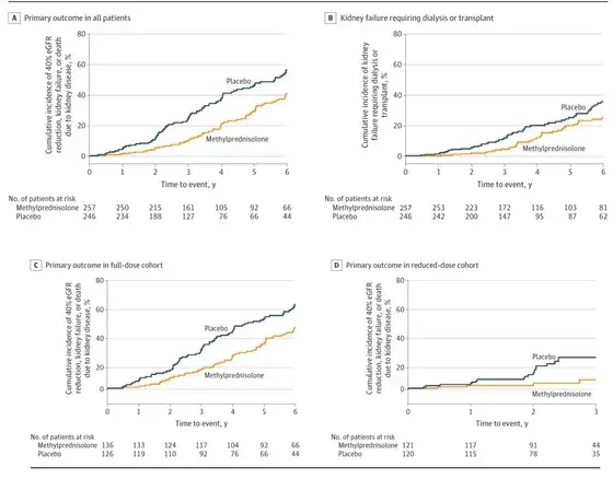 O risco de insuficiência renal dialítica ou transplante foi significativamente menor no grupo metilprednisolona do que no grupo placebo (50 [19,5%] vs 67 [27,2%]; HR, 0,59 [IC 95%, 0,40- 0,87]; P = 0,008; a diferença anual da taxa de eventos, **-2,9% ao ano** [IC de 95%, -5,4% a -0,3%] **(Figura B).**