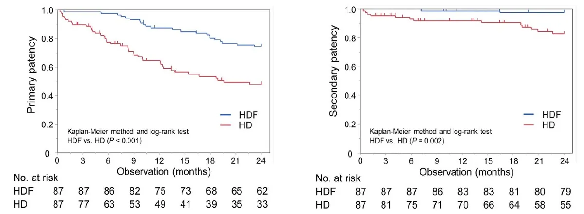 * Patência primária 24 meses: HDF 74,2% vs HD 47,7% (p<0,001).