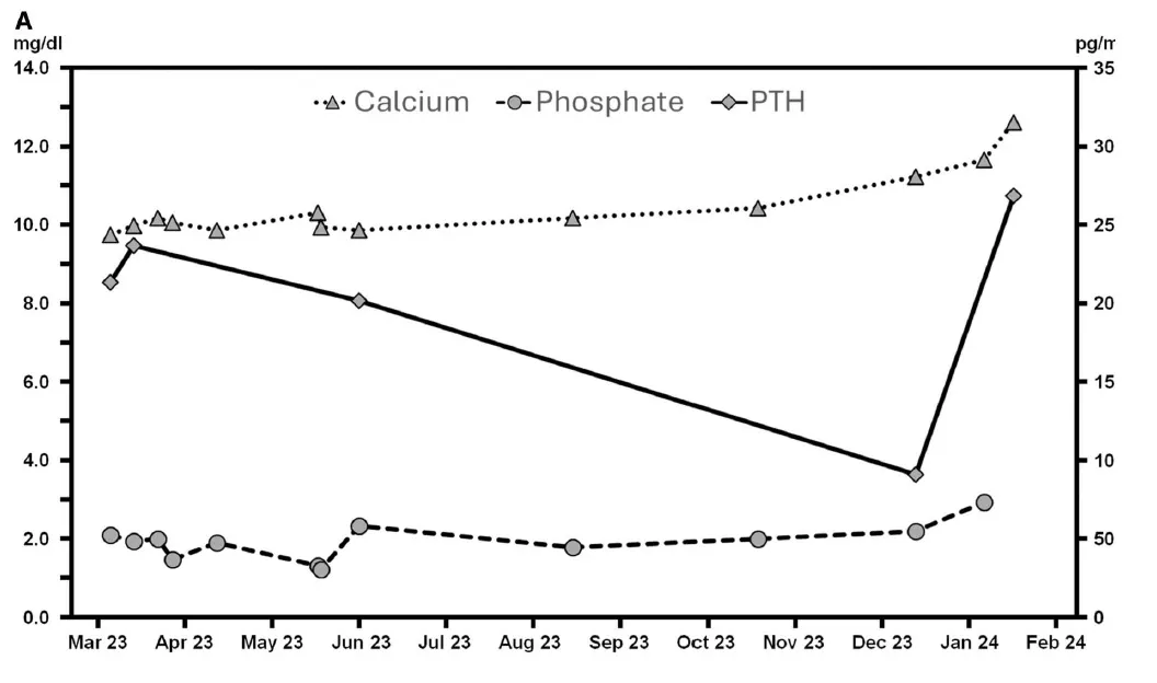 Changes in the levels of total calcium, phosphate, and intact PTH in the months before admission (reference range: calcium 8.8–10.2 mg/dl; phosphate 2.5–4.5 mg/dl; PTH 15.0–65.0 pg/ml).