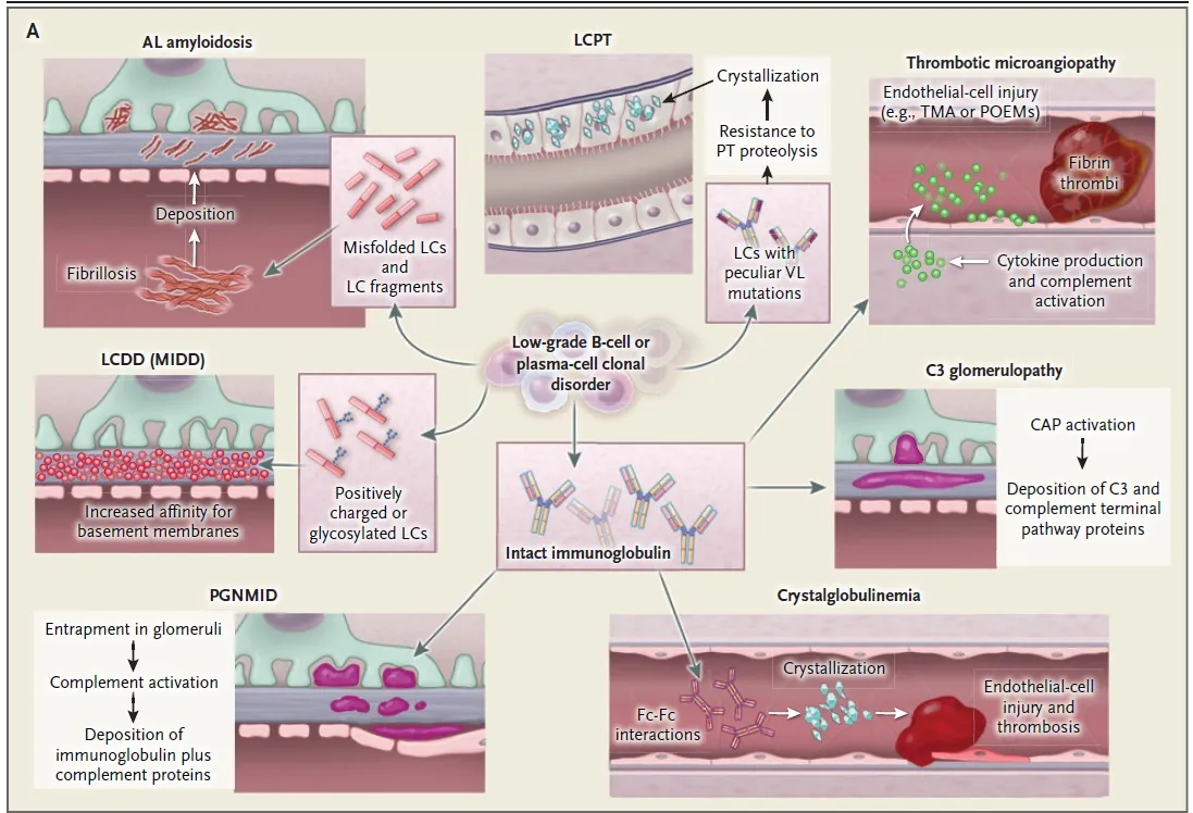 As imunoglobulinas monoclonais têm propriedades bioquímicas específicas (ex: carga positiva, glicação anormal, resistência à degradação) que induzem diferentes padrões de lesão renal (seja causando deposição ou desencadeando inflamação (Figura 1):