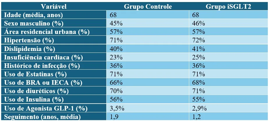 Como o estudo foi desenhado? Os autores utilizaram o recurso de propensity score matching (1:4) para equilibrar as características basais entre os grupos. As principais variáveis consideradas incluíram idade, sexo, comorbidades, histórico de hospitalizações e medicamentos utilizados.