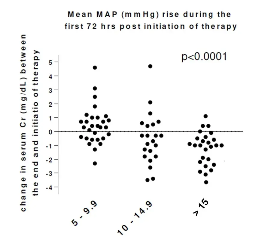 Sabemos que elevar a PAM na SHR tipo 1 é benéfica, porém não sabemos quanto de elevação da PAM é necessário. **Neste estudo uma elevação de PAM** **≥ 15 mmHg parece adicionar um maior benefício do que elevação menos pronunciada de 5-10 mmHg.** Elevação da PAM pode ter efeitos colaterais (EAP e taquicardia), portanto, serão necessários estudos prospectivos/randomizados para uma meta mais agressiva de PAM.