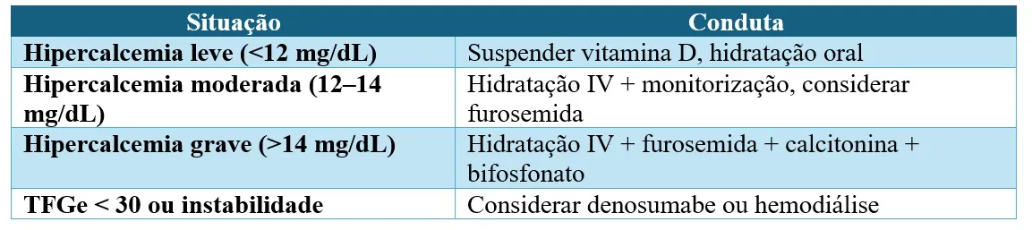 A hipercalcemia induzida por intoxicação por vitamina D é um desafio clínico cada vez mais comum, especialmente com a crescente prescrição de "megadoses" sem indicação formal... A gravidade dos sintomas é diretamente proporcional à velocidade e ao grau de elevação do cálcio iônico, sendo que o tratamento deve focar tanto na reversão da hipercalcemia quanto na causa subjacente.