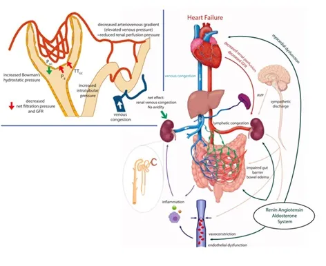 A pressão venosa elevada, traduzida clinicamente como ingurgitamento jugular e edema, é hoje reconhecida como o principal determinante da queda de TFGe na IC – mais do que o tradicional “baixo débito”. É a congestão venosa renal que reduz a perfusão efetiva e piora a função renal.
