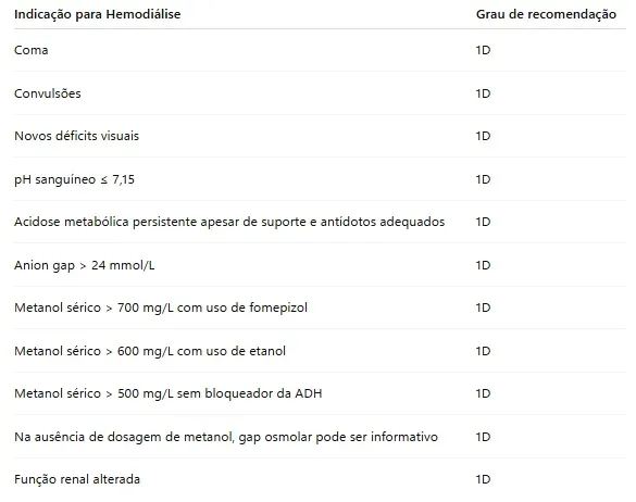 * Metanol >50 mg/dL → recomendar HD, mesmo sem acidose/lesão orgânica, pois a eliminação sob ADH inibida é muito lenta.