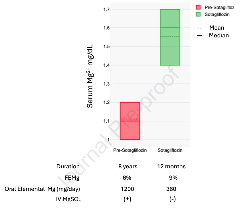 * O uso do sotagliflozina foi associado a aumento dos níveis séricos de magnésio de 1,11 ± 0,09 mg/dL para 1,55 ± 0,13 mg/dL (p < 0,0001), com normalização clínica e laboratorial.